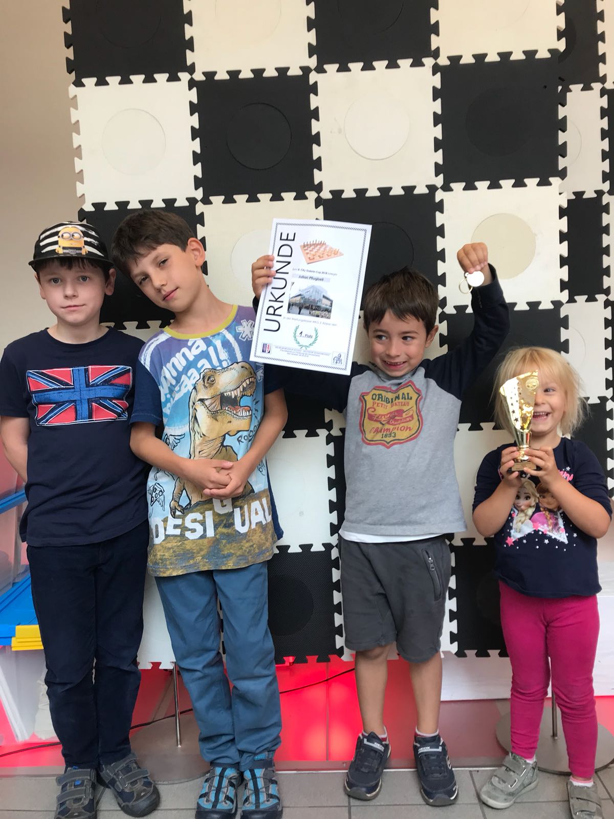 Joel, Eric, Julian und seine stolze Schwester darf den Pokal halten