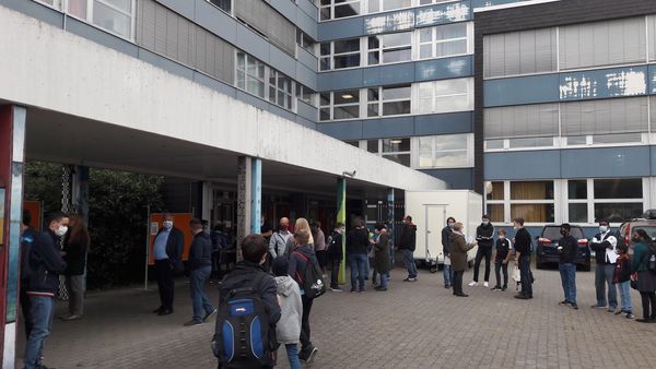 Internet Veranstaltungsort Schlangestehen mit Abstand vor Zutritt zum Turniersaal. Coronabedingt erhielten nur Spieler und registrierte Betreuer bzw. Eltern Zulass. Für alle anderen hieß es: Wir müssen leider draußen bleiben.