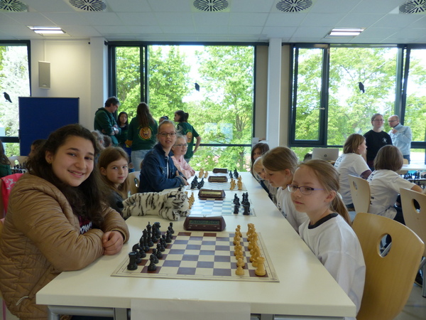 P1280216 links Sarah, Frieda, Fenja und Jelena gegen den SV Oberursel U10 mit Julia am 4. Brett gegen Sarah.