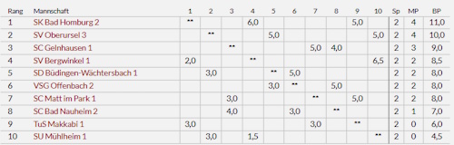 Im Ergebnis fuhren wir einen ungefährdeten 6,5 : 1,5 Sieg ein, wobei die hinteren 4 Bretter - also die erwähnten Ersatzleute - jeweils gewannen. Mit diesem Sieg stehen wir mit einem Mannschaftspunkt hinter Spitzenreiter Oberursel auf dem dritten Tabellenplatz.