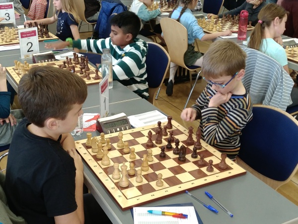 Wesentlich zügiger gingen die Partien im U10-Open über die Runden. Hier kamen Malte auf 5½ und Justus auf 5 Punkte und es war selten, dass sie ihre Bedenkzeit ausschöpften. Häufig hatten sie nach der Partie mehr Zeit auf der Uhr als zu Beginn. Dennoch: Es blieb genug Konzentration übrig, um neu gelernte Eröffnungen auszuprobieren.