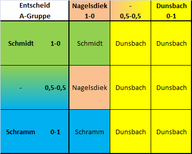 Und wie fällt die Entscheidung aus? Die beste Chance hat naturgemäß Ralf Dunsbach, der einen halben Punkt Vorsprung und eine gute Zweitwertung hat. Verliert er allerdings, wird einer der drei anderen Meister, siehe Bild.
