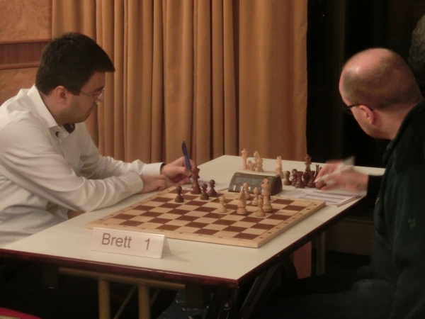 Das Spiel spitzte sich dramatisch zu, als in der 4. Spielstunde die Zeitnot aufkam. Alexander Haucke hatte zu wenig Kompensation für seinen Gambit-Bauern bekommen und war froh, dass er in ein Remis abwickeln konnte.