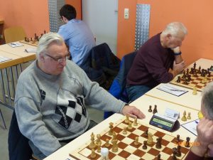 Jetzt stand es 4 : 3 für Bad Homburg. Es folgte ein Krimi für die Zuschauer. Nach bis dahin wechselseitigem Spiel standen die Chancen überwiegend auf der Seite des Gegners von Matthias Schramm. In einer beiderseitigen Zeitnotphase von jeweils 2,5 Minuten entschloss er sich zum Turmopfer auf b3.