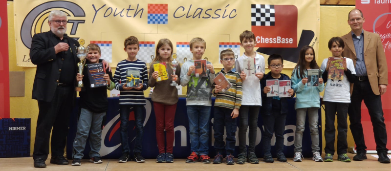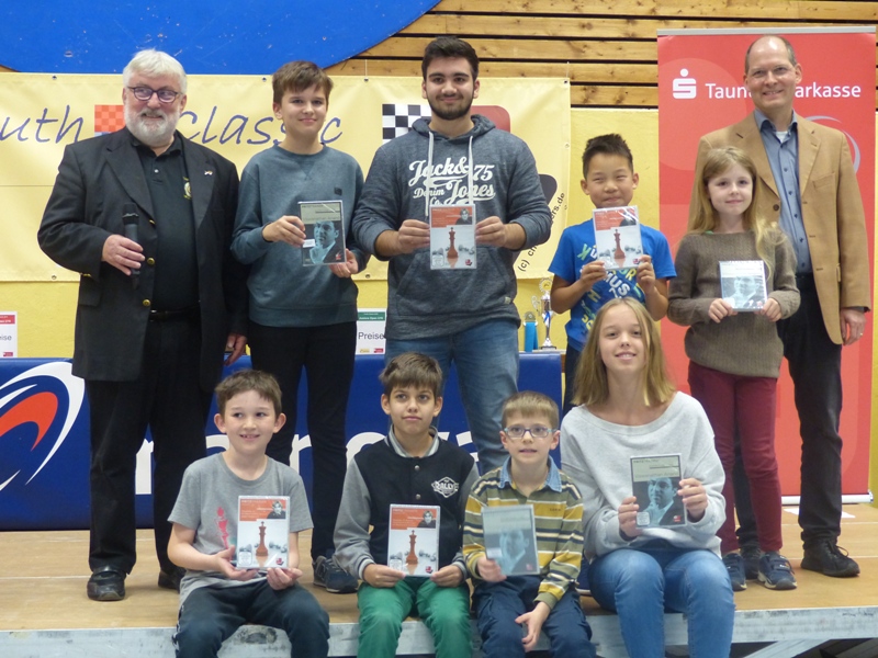 Siegerehrung der U10. Justus genau in der Mitte. Aber der Dank geht vor allem die großen Chess-Tigers auf den Außenbahnen (Hans-Walter Schmitt und Ralph Neininger)!
