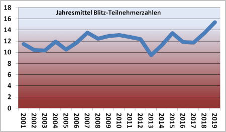Die mittlere Anzahl der Teilnehmer an den Blitzturnieren. Das Jahr 2019 sticht jetzt schon mit einem Mittelwert von fast 16 heraus!Also: Freitag ist Blitz! In der Albin-Göhring-Halle! Beginn: 20:15 Uhr