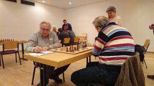 Die Partie von Wolfgang Gebauer sah lange nach einem friedlichen Ausgang aus, bis der Gegner in der Zeitnotphase nach einem groben Fehler einen Turm und damit auch die Partie verlor.