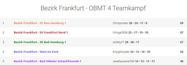 Nachdem bei der ersten Auflage noch 7 Teams am Start waren, hat sich das wöchentliche Online-Bezirks-Mannschafts-Turnier inzwischen als Turnier für 5 Vereine etabliert.