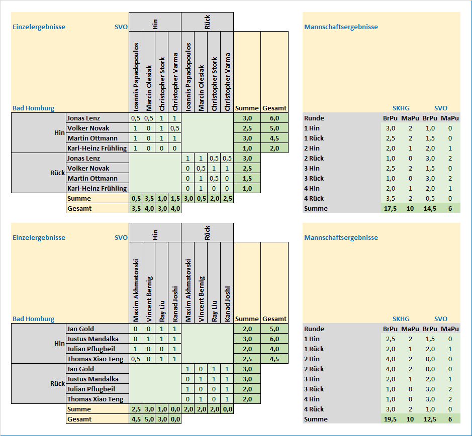 Durch die Mannschaftspunkt-Logik liest sich der Endstand deutlich - aber es gab dieses Mal keine leichten Punkte und ein relativ ausgeglichenes Ergebnis. Letztlich konnte aber Bad Homburg sowohl das Erwachsenen- als auch das Jugend-Match für sich entscheiden!