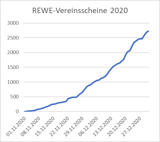 Die REWE-Aktion Scheine für Vereine lief in diesem Jahr angesichts der Corona-Pandemie und der geringen Interaktion der Mitglieder untereinander auf Sparflamme. Eigentlich gab es nur einen einzigen Aufruf zum Start der Aktion, von der offensichtlich zahlreichen individuellen Werbung der Mitglieder mal abgesehen.