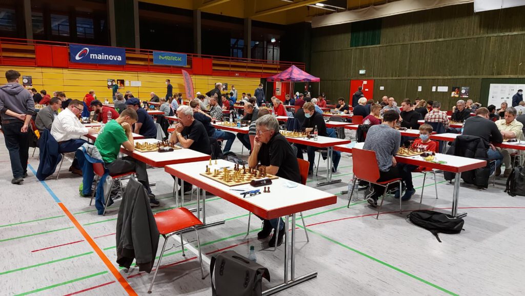 Nach der langen coronabedingten Pause war dies eins der ersten Turniere im näheren Umkreis (Groß-Zimmern liegt ein Stück östlich von Darmstadt) und so stellte der Schachklub Bad Homburg mit insgesamt 11 von 100 Teilnehmern (Anton, Christoph, Danail, Frieda, Hans, Jonas, Justus, Robin, Thomas, Victor und Uwe!) nach dem Gastgeber die zweitgrößte Gruppe.