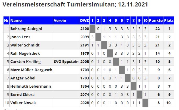 Sieger des Simultan-Turniers wurde Behrang Sadeghi mit einem Punkt Vorsprung vor den Zweitplatzierten Jonas Lenz und Walter Schmidt.