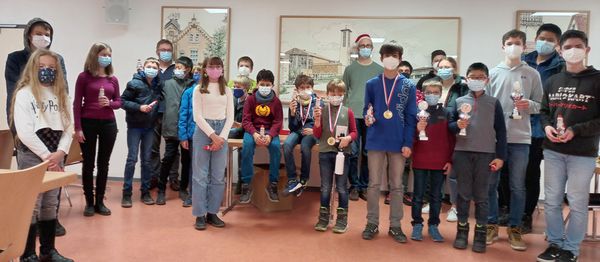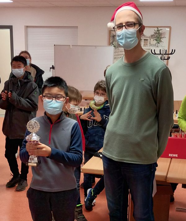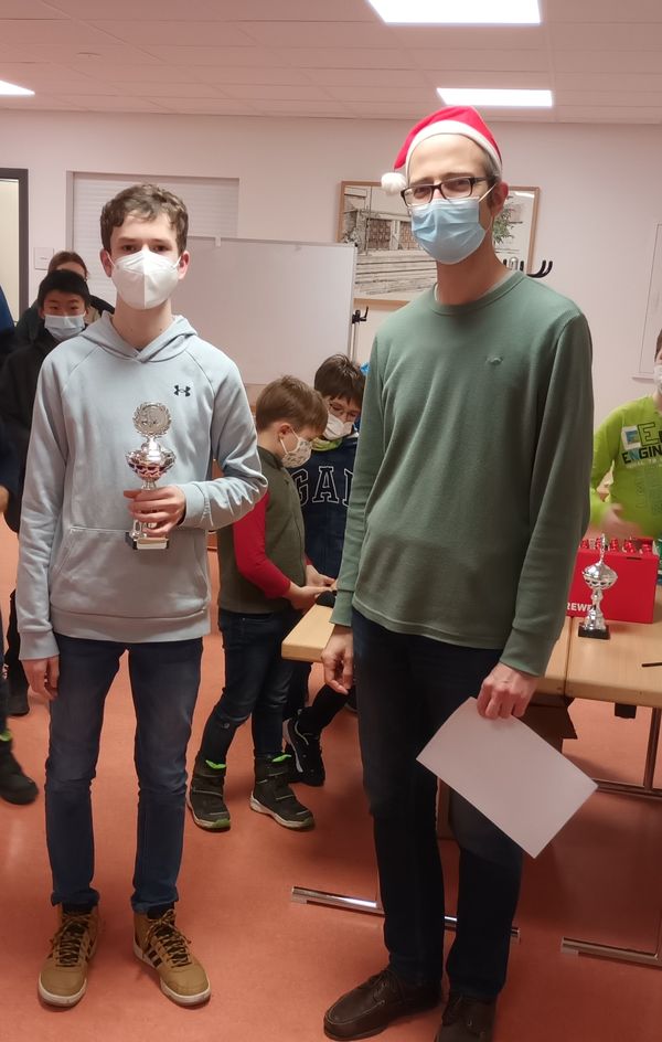 Im Anschluss gab es dann noch die Siegerehrung zur diesjährigen Jugend-Vereinsmeisterschaft. Wie auch schon bei der letzten Ausrichtung in 2019 wurde das Turnier wieder an sechs Spieltagen im eher ungewöhnlich Keizer-System ausgetragen. Aber egal in welchem System ein Turnier gespielt wird, wenn ein Spieler alle Runden gewinnt, ist das eine sehr souveräne Angelegenheit und mit diesem perfekten Ergebnis konnte Justus seinen 2019 errungenen Titel erfolgreich verteidigen.