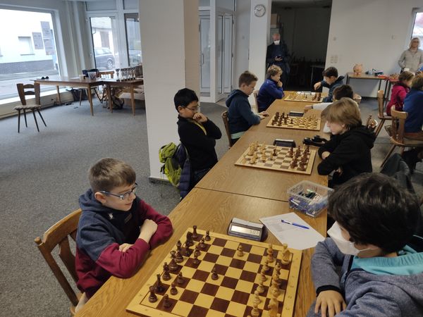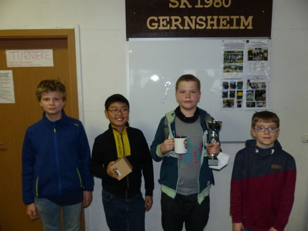 Am Samstag richtete der SK Gernsheim die diesjährige Hessische Jugend-Blitzmannschaftsmeisterschaft aus. Für uns gingen mit Jan, Frieda, Christoph & Maxi in der U16 und mit Justus, Thomas, Till und Cornelius in der U14 gleich zwei Mannschaften an den Start. Leider war die Meisterschaft in diesem Jahr mit nur 8 Mannschaften nicht so gut besucht und so wurde ein doppelrundiges Rundenturnier („jeder gegen jeden“) mit einer Bedenkzeit von 5 Minuten plus 3 Sekunden Inkrement gespielt.