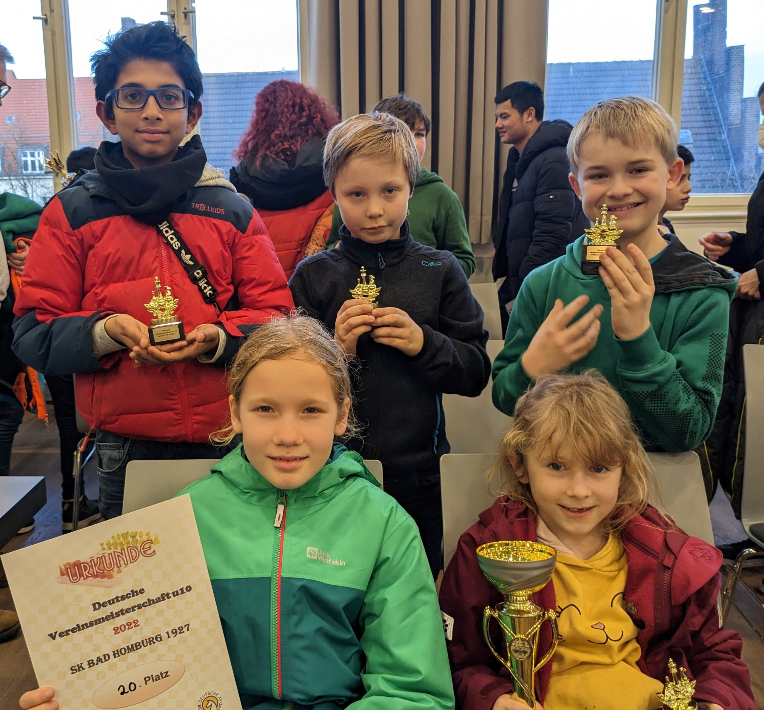 Etwas überraschend gab es auch noch eine separate Siegerehrung des Ersatzspielerturniers und dort zeigte sich wie ausgeglichen unser Team besetzt war. Mit 5 Punkten in den 7 Runden belegte das Team dort den 2. Platz! Damit sind wir sozusagen Deutscher Vizemeister der U10-Ersatzspieler und wurden mit einem großen Pokal belohnt. Herzlichen Glückwunsch an das ganze Team!