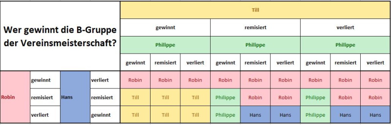Der, der die meisten Punkte hat, natürlich. Und bei Punktgleichheit lautet die Reihenfolge in der Zweitwertung (Turnierperformance) Robin, Till, Philippe, Hans, Tero. Daraus ergibt sich folgendes Diagramm: