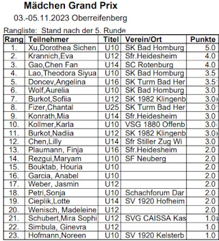 Die Hessische Schachjugend um Friedericke Tampe trug eine Runde des Mädchen-Grand-Prix in der Jugendherberge Oberrreifenberg aus. Dort waren aus Bad Homburg die Mädchen-Power-Gruppe mit Thea, Dora, Aurelia dabei - und die drei landeten nicht nur auf den Plätzen 1 bis 3 der U10-Altersgruppe (gleichwohl selbst noch U8), sondern sie belegten auch die Plätze 1, 4 und 6 der Gesamttabelle.