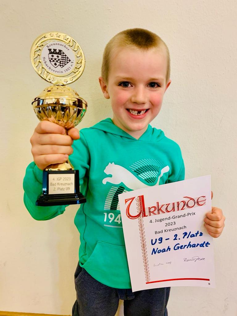 Der erst 5jährige (fast 6!) Noah war der Held des U9-Grand-Prix in Rhein-Hessen. Er belegte mit 6 Punkten aus 7 Partien den zweiten Platz und konnte stolz einen weiteren schönen Pokal mit nach Hause nehmen.