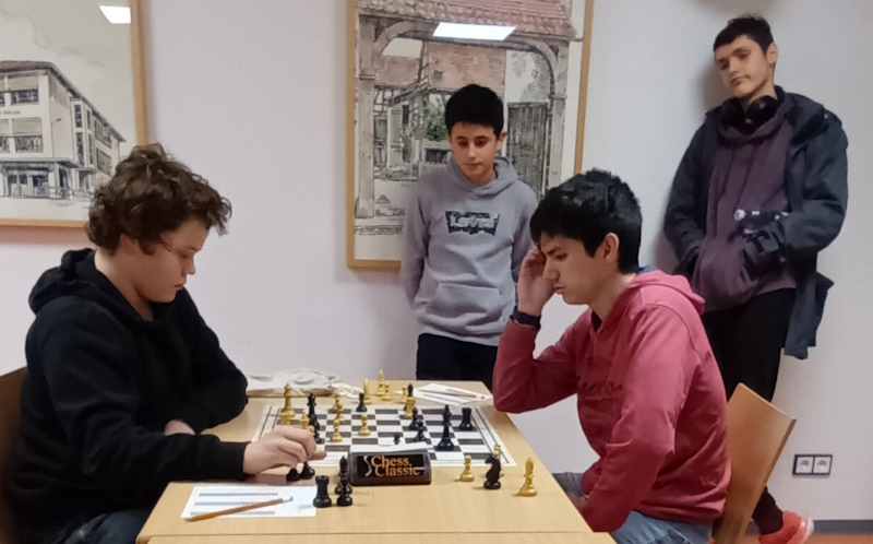 Außerdem fand zu vor die Februar-Runde der Vereins-Jugend-Meisterschaft statt - und auch die gipfelte in einem Titanenkampf: Till, der ein ausgesprochen gutes Ergebnis gegen Pedro hat, überspielte ihn schon wieder und musste erst in beidseitiger Zeitnot ins Remis durch Dauerschach einwilligen.
