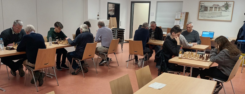 Das Turnier begann etwas später, weil das Vereinshaus von ca. unendlich vielen U10-Kindern mit ihren Betreuern belegt war, denn an diesem Wochenende werden ja an diesem Ausweichort die U10 und die U10w-Meisterschaften der Hessischen Schachjugend ausgetragen.