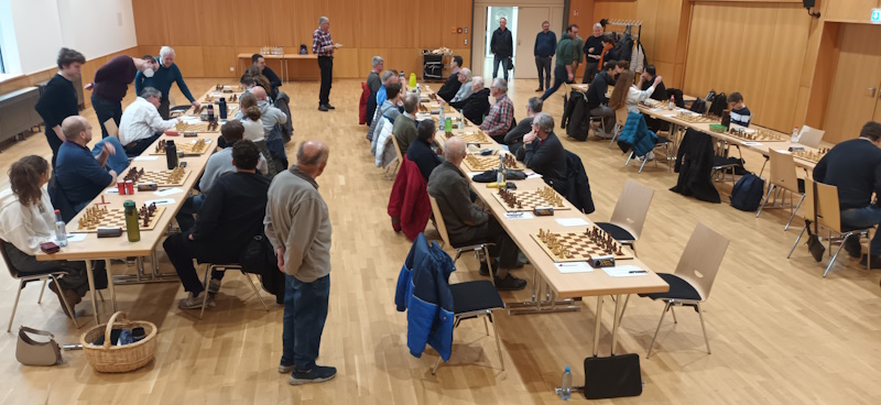 Ich hatte am ersten Brett mit Schwarz eine wilde Königsgambits-Stellung, die mich viel Bedenkzeit gekostet hatte. Mit noch 3 Minuten auf der Uhr bei noch zu machenden 16 Zügen war ein unübersichtliches Figurenopfer der einzige Weg zum Weiterkommen. Dem Gegner war die Stellung wohl auch unangenehm, er bot Remis an. Da die noch laufenden Partien ganz gut aussahen, nahm ich das Angebot an.