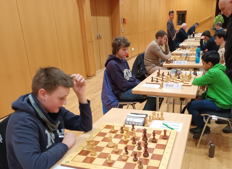 Völlig auf der Kippe stand das Match in der Bezirksklasse. Ilya gewann sehr schnell, Thomas remisierte problemlos, aber Jan Peter musste ein Endspiel aufgeben, so dass es zunächst 1,5:1,5 stand.