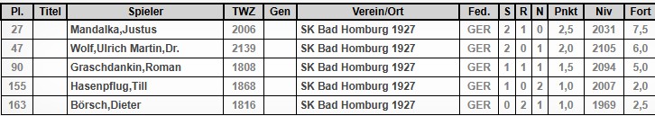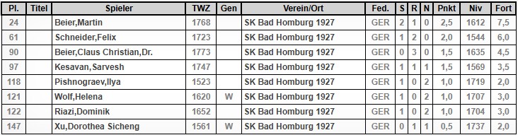 Das läuft bisher prima. In Bad Wildungen landeten Stefan Erdmann und Wolfgang Gebauer zuletzt Siege. Der beste Bad Homburger in Heusenstamm ist derzeit Justus mit sehr starken 2,5 Punkten aus 3 Partien (Gegnerschnitt über 2000!), aber Uli Wolf liegt bei stärkeren Gegnern mit 2 Punkten knapp dahinter. Hervorhebenswert ist auch Roman mit seinen 1,5 Punkten.