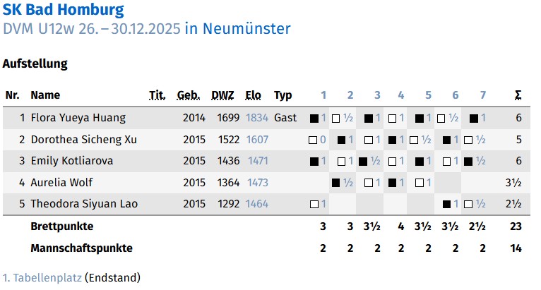 Das ist ein wunderschöner Schlussstrich unter ein erfolgreiches Schachjahr der Bad Homburger Schachjugend, die in 8 Teilnahmen an der Deutschen-Einzelmeisterschaft in Willingen und in 4 Teilnahmen an der Deutschen-Jugend-Vereinsmeisterschaft gipfelte.