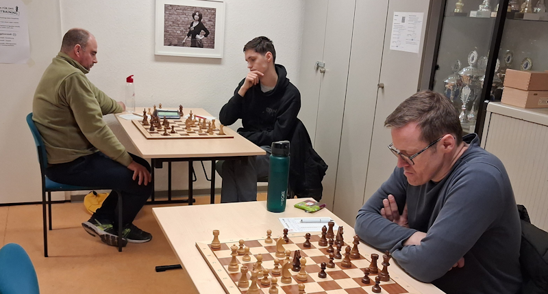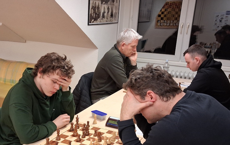 Der Reihe nach: Die kürzeste Partie gabs bei Hendrik, der sich im Damengambit auf eine ungünstige Zugfolge einließ, statt einfach (vorteilhaft) in die Abtauschvariante einzulenken. Er hatte dann die Wahl, sein Läuferpaar aufzugeben oder in eine Zugwiederholung einzuwilligen – Remis. Till dagegen kam gut aus der Eröffnung und setzte seinen Gegner mit Schwarz unter Druck. Sein Königsangriff sah vielversprechend aus (und bestimmt findet die Engine irgendwo einen Gewinnweg). In komplizierter Stellung konnte sich der Gegner eine Mehrfigur sichern und Tills Freibauern auf der zweiten Reihe stoppen.
