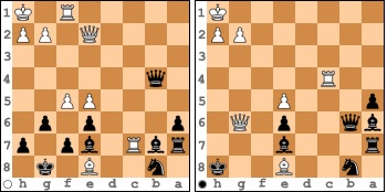 Alles lief wie am Schnürchen in der Grünfeld-Verteidigung und nach 25 Zügen hatte ich zwei Leichtfiguren und einen Bauern für einen Turm. In zunehmender Zeitnot spielte ich dann voreilig 26. ... Ta7?? (linkes Diagramm), wonach für Weiß 26. Lxf7+ leicht gewonnen hätte.