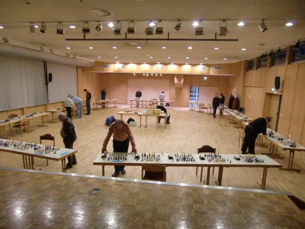Der Reihe nach: Ein Turniersimultan mit 10 Teilnehmern bedeutet viel Arbeit. 45 Bretter und reichlich Beschriftungen müssen her, damit so ein Event reibungslos klappt. Hier geht ein ganz herzlicher Dank an