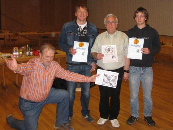 Siegerehrung: Paul Lenhart lässt dem Turniersieger Hellmuth Lebermann, Vizemeister Dirk Schneider und Jonas Lenz applaudieren. (Foto: Ingo Hanemann)