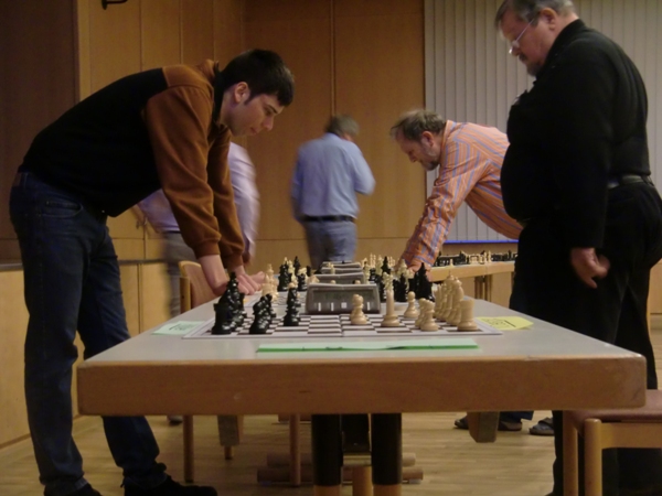 Theorie wurde auch gespielt. So lief Rainer Berg mit Schwarz in eine ganz schlechte Schottisch-Variante.
