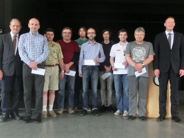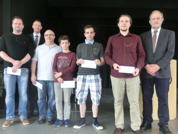 Gruppenbild mit Großmeistern: Vereinsvorsitz Paul Lenhart (l.) und Oberbürgermeister Alexander Hetjes (r.) ehren die Sieger im A-Open.