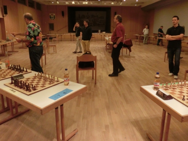 Das Turnier war das dritte der Serie und dieses Mal war wieder die erste Garde `dran, da nicht jedes Jahr jeder mitspielen kann: Der Aufwand für ein gleichzeitiges Simultan 10 gegen 10 ist beträchtlich, da 45 Bretter samt Tischen organisiert werden müssen. Zusammen mit dem Markierungen für die Tische ("Wegweiser!") dauert so ein Aufbau schon mal eine Stunde.
