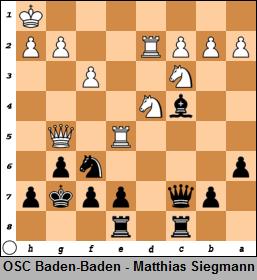 Auch Matthias Siegmann, der mit Schwarz die Drachenvariante der sizilianischen Verteidigung gewählt hatte, wurde immer weiter in die Defensive gedrängt, konnte dann aber von einem Fehler profitieren und gleich zwei Bauern gewinnen. In unklarer Stellung, denn Weiß hatte als Kompensation weiterhin einen starken Angriff, bot er Remis an, das GM Jan Gustafsson nach kurzer Beurteilung der Stellung schliesslich annahm. (In der Diagrammstellung zog der OSC den schwachen Zug 26. b3, den Matthias mit 26. ... Lxb3 27. Sd1 Lxa2 und Remisangebot beantwortete.)