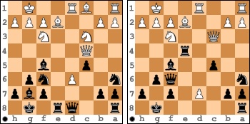 Allerdings bekam hier schon Ralf Dunsbach zu spüren, was es heißt, wenn der Gegner vorbereitet ist. Die linke Diagrammstellung war von beiden Kontrahenten rasch aufs Brett gespielt. Hinterher ist leicht herausgefunden, dass man einer Partie Karpov-Kasparov, WM 1987 folgte und jetzt nur der Zug 13. ... h6! richtig ist.