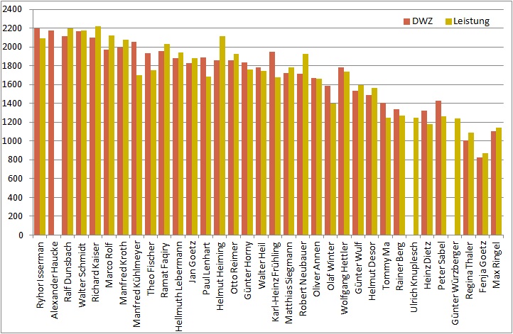 DWZ-Zahl und Performance aller Bad Homburger Spieler mit mehr als 4 Partien. Das waren insgesamt 34 der 50 eingesetzten Spieler. Auch optisch auffallend übrigens die außerordentlich guten Leistungen von Marco Rolf, Helmut Heiming und (erneut!) Robert Neubauer. Top-Leistungsträger war knapp Richard Kaiser.