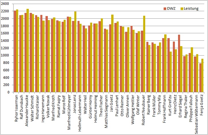 DWZ-Zahl und Performance aller Bad Homburger Spieler mit mehr als 4 Partien. Das waren insgesamt 36 der 60 eingesetzten Spieler. Auch optisch auffallend übrigens die außerordentlich guten Leistungen von Jonas Lenz, Jan Goetz und Robert Neubauer. Top-Leistungsträger war Alexander Haucke.