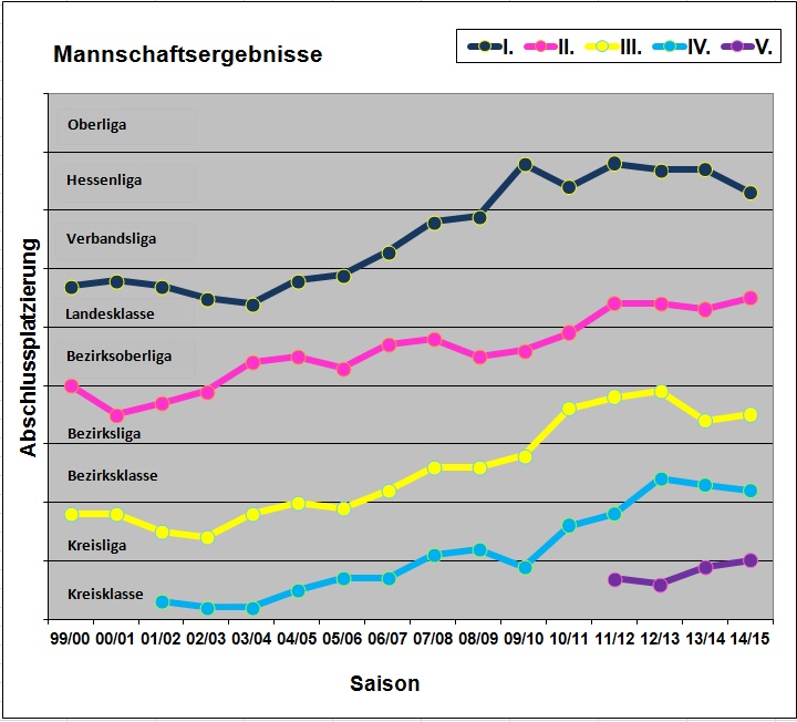 - Hessenliga: Das war die schwerste Saison in den 6 Jahren der Zugehörigkeit zu höchsten Hessischen Liga. Von Anfang an abstiegsbedroht gelang der Klassenerhalt erst mit dem Schlussgong der letzten Runde. Allerdings muss man auch sagen, dass die Liga so ausgeglichen wie nie zu vor war: Mit 12 Punkten war man Meister, mit 6 Punkten aber Absteiger!