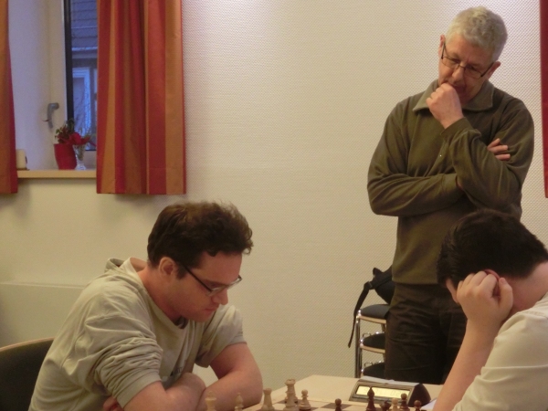 Spannung herrschte dann jedoch an den ausgeglichen besetzten ersten und letzten Brettern. Ersatzmann Theo Fischer hatte eine völlig verwickelte Stellung auf dem Brett, als sein Gegner in Zeitnot den Faden verlor und nach einem Damengewinn nacheinander viele Figuren zurückverlor, bis nichts mehr übrig blieb: 6:1 für Bad Homburg.