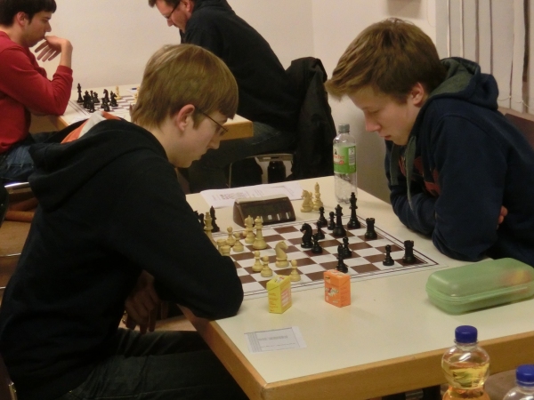 Vincent Skiera, vorne links, siegt nach reichlichen Verwicklungen in der ersten Schnellpartie und hielt anschließend die zweite Remis.
