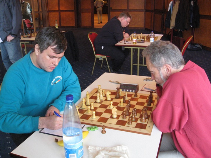 Volker Novak (rechts) kritisiert selbst seine Wettkampfhärte. Völlig zu Unrecht: Er zählt zu den Punktelieferanten der Mannschaft. Heute ein Remis gegen Felix Kayser, der bisher bei 100% der Punkte notierte!