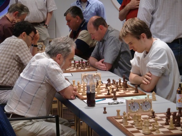 Ryhor Isserman (vorne links) gegen Hagen Poetsch: Beide knieten sich tief in die Partie, aber Poetsch behielt klar die Oberhand. "Der hat gespielt wie ein Großmeister!", so der anschließende Kommentar von Ryhor Isserman.