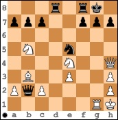 In der Diagrammstellung baute er eine Springergabel als Verlockung für den Gegner auf, die dieser mit 25. ... Sf3 annahm, doch nach 26. Sf6+ erkannte er, dass er nun wohl seine Dame geben müsse um nicht Matt gesetzt zu werden.