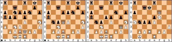 Doch bereits 3 weitere Züge bekam Jelena nach ein paar ungenauen Zügen ihres Gegners endlich Initiative gegen den schwarzen König und startete diese in der dritten Diagrammstellung auch vorbildlich mit 26. Sf5. Etwas später startete sie ihre Königsjagd und gewann in der letzten Diagrammstellung mit 34. Sb6+ die schwarze Dame.