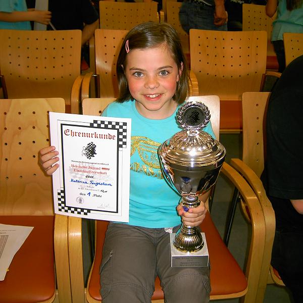Der Schachklub Bad Homburg hat einen Hessenmeister: Katerina Torgashov gelang in der der Gruppe U12 der Hessischen Jugendmeisterschaft der Sprung an die Spitze der Mädchenwertung! Sie erzielte 6½ Punkte aus 9 Runden und lief in der Gesamtwertung auf dem geteilten dritten Platz ein. Die vor ihr liegenden Spieler haben übrigens allesamt eine DWZ von über 1400 und entsprechende Turniererfahrung. Katerina selbst legte durch das Turnier über 200 Punkte zu.