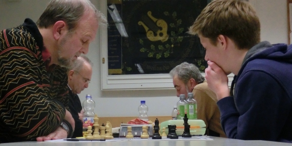 Turnierleiter Paul Lenhart schafft gerade die Wende in seiner Schlussrundenpartie gegen Pascal Wintermeyer. Im Hintergrund versucht noch Ryhor Isserman, seine unbestreitbaren Vorteile zu verwerten, aber das klappte nicht.