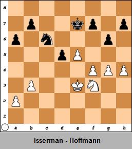 Die Beinahe-Sensation des Tages gelang schließlich Frank Hoffmann: Er hatte Schwarz gegen Papierfavorit Ryhor Isserman. Eigentlich eine klare Sache, angesichts der 900 DWZ-Punkte (!!) Unterschied. Nun, Ryhor spielte wie immer, brandmarkte eine Bauernschwäche auf d5, aber mehr bekam er nicht. Es wurde immer mehr abgetauscht bis ein reines Springerendspiel entstanden war. Klar, der schwache Bauer war hier sehr spürbar und zwang Frank zu reinen Defensivzügen - aber es war zunächst kein Durchkommen zu erkennen. In dieser Phase atmete Ryhor Isserman auch beruhigt auf, als er bestätigt bekam, dass das Turnier nicht DWZ-Ausgewertet wird. Erst nach der Zeitkontrolle lies Frank Hoffmann auch noch den Abtausch des Springers zu und ein Routine-Bauerndurchbruch brachte dann endlich den ganzen Punkt für Ryhor Isserman.