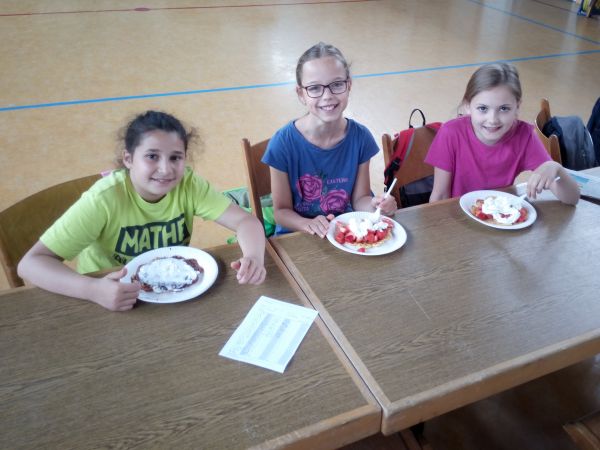 Die Mädels in ihrer verdienten Mittagspause: Waffeln mit Erdbeeren.